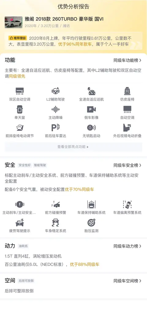 综上所述的新车含税价、用车成本、市场行情、优势分析、同款比价等数据仅供参考。在配置部分,因为二手车非标品,车辆可能会存在配置改装的情况,具体车况信息需要线下结合车辆实际情况进行综合参考。