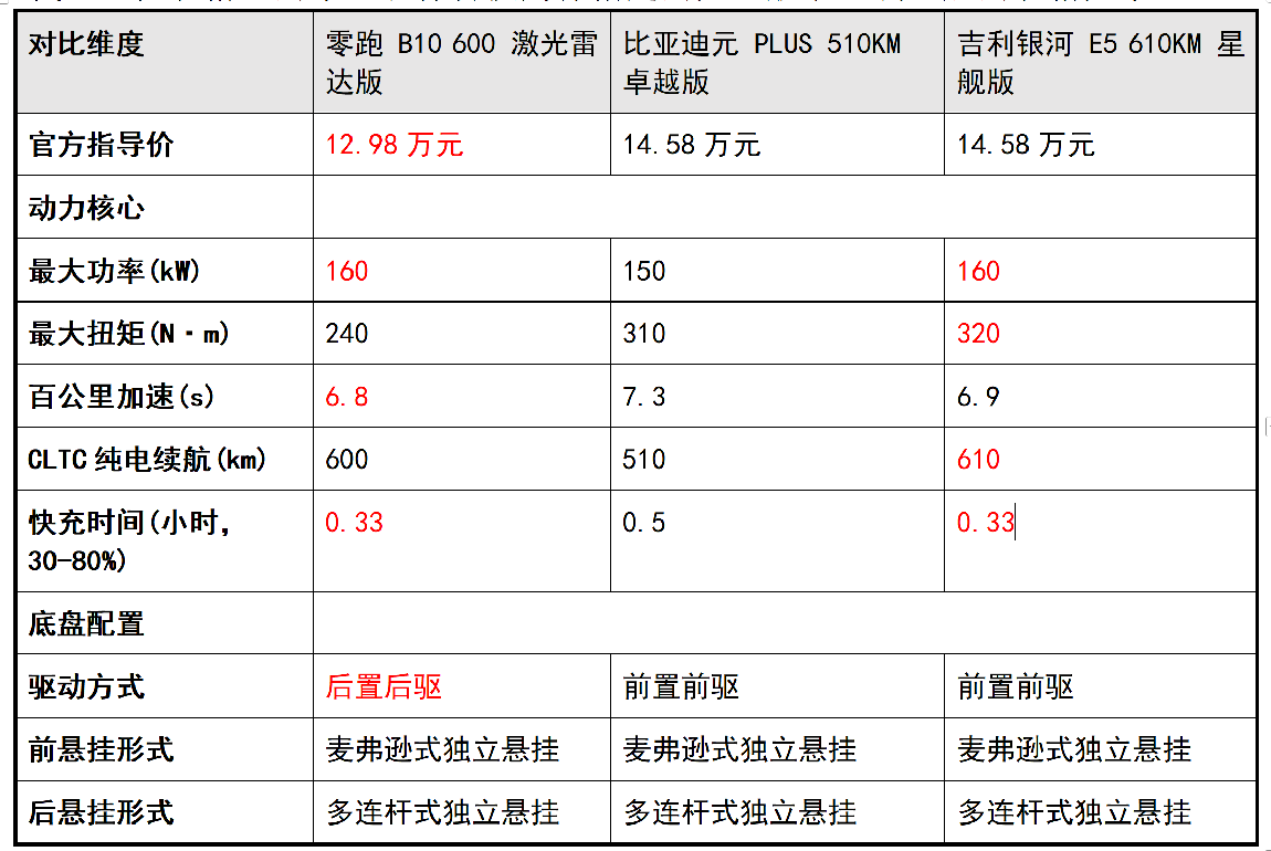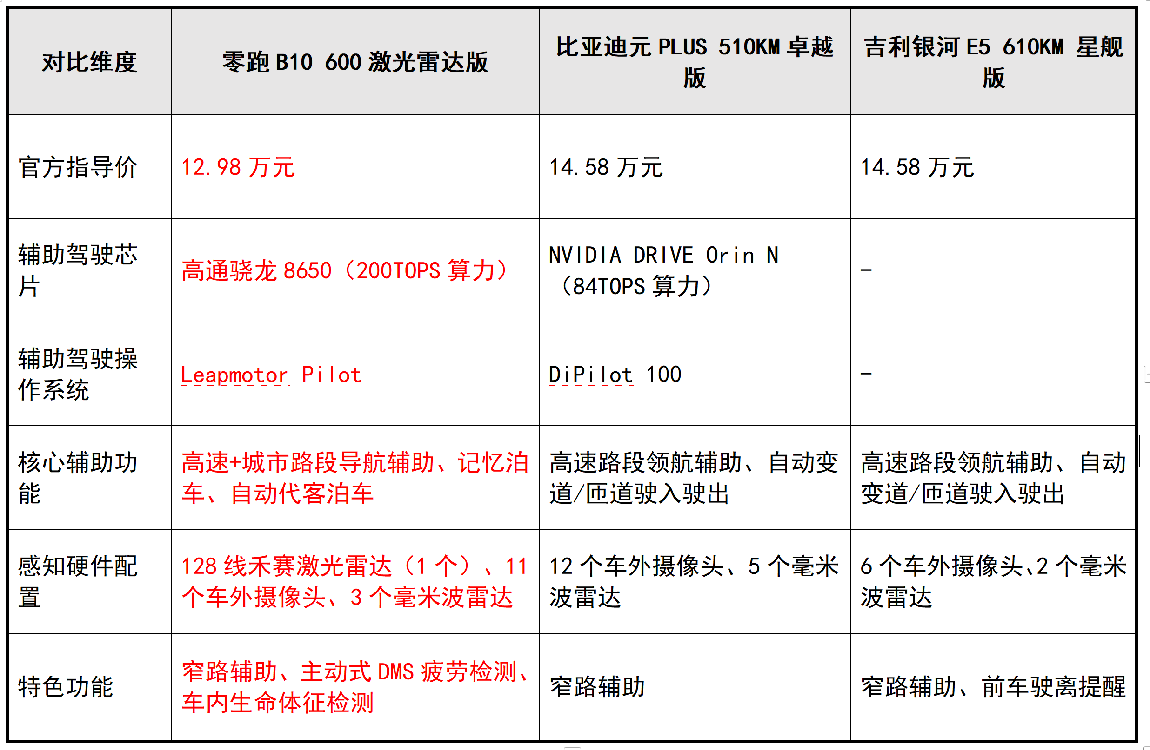 零跑 B10 600 激光雷达版 相比于吉利银河 E5 610 KM 星舰版 和比亚迪元 PLUS 510KM 卓越版,优势明显突出不少。硬件部分,零跑 B10 600 激光雷达版 搭载了禾赛科技 128 线激光雷达和高通骁龙 8650 驾驶辅助芯片,可支持高速领航、城市领航及自动泊车辅助等功能。