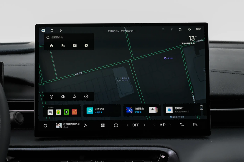 在基础硬件配置上,吉利银河 E5 搭载了龍鹰一号座舱芯片,匹配 Flyme Auto 车机系统,流畅性和功能表现都很不错,起码能轻松下载各类娱乐软件。