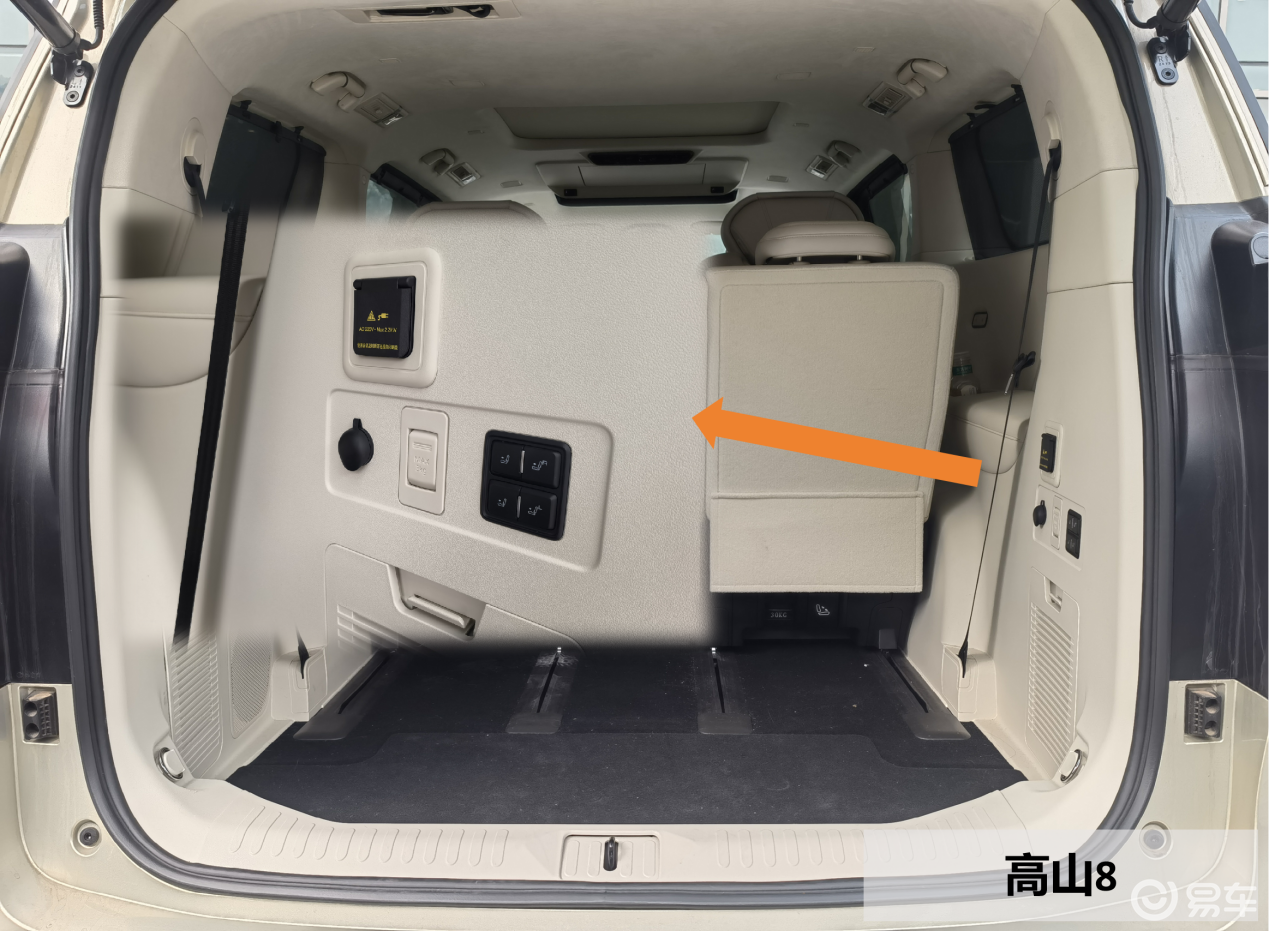 最后,看看三排之外的储物空间。高山8没有下沉式的设计,但是这部分空间足够富余平整,能容纳大件行李。第三排座椅可以前后滑动,也支持电动调节折叠,易于操作。