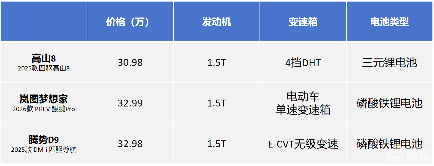 基于【1.5T插混四驱】大前提,我们选择价格相近的三款进行对比:岚图梦想家是32.99万起(鲲鹏Pro),腾势D9是32.98万起(四驱尊航型),而魏牌高山8是30.98万起。尺寸方面,岚图梦想家数据领先,高山8和腾势D9大体相当——高山8的价格优势很明显,也是它能后来居上的关键原因。