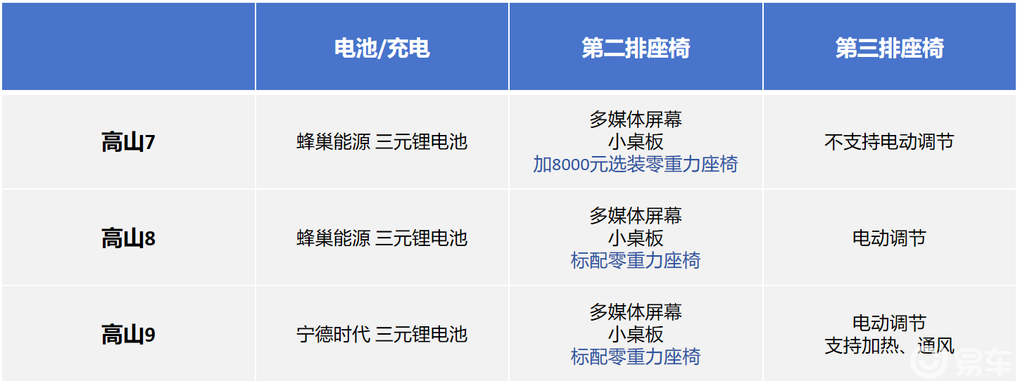 除了体型,高山7、8、9三款车配置差异不大,发动机型号和变速箱均相同,高山7和高山8采用蜂巢能源三元锂电池,而高山9采用宁德时代电芯。智能化方面,三台车也是齐平的,智能辅助驾驶的硬件均为英伟达Orin-X芯片+3毫米波雷达+1个激光雷达。下表总结出不同点。