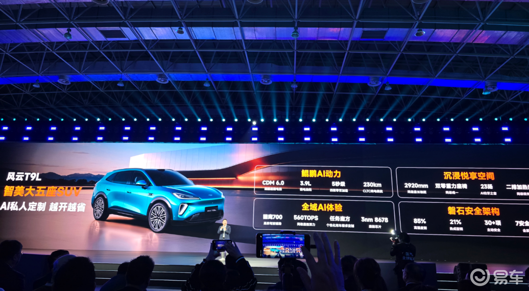 第一款车是风云 T9L。作为本次 AI 之夜最核心的量产车型之一,这款大五座 SUV,也是奇瑞鲲鹏 AI 动力和猎鹰 700 辅助驾驶的重要载体。