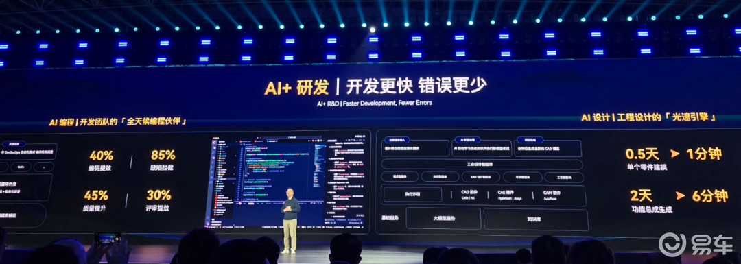 在研发环节,AI 被用于工程设计、编程和仿真。通过 AI 编程工具,开发效率和代码质量同步提升;在设计侧,CAD 设计智能体可以直接参与零部件和总成建模,把原本以天为单位的工作压缩到了分钟级。