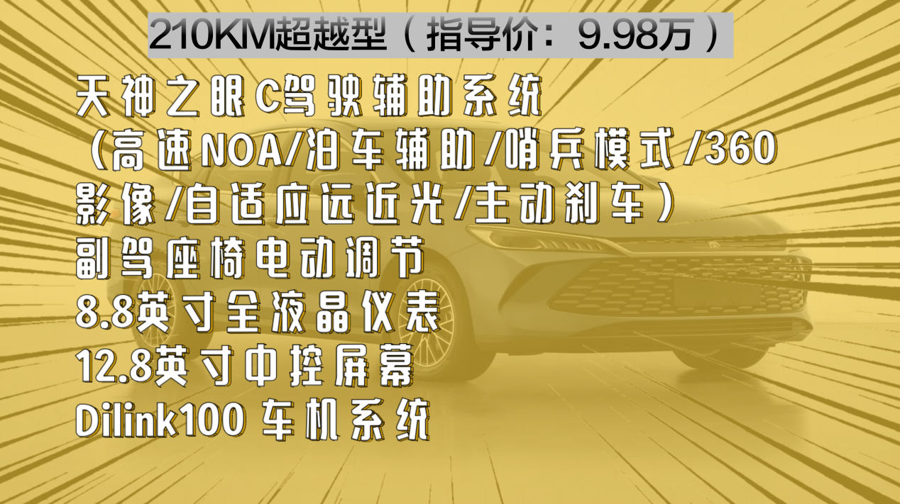 再来看高配的210KM超越型,指导价继续贵了1万,来到了9.98万。加上购置税,保险,还是走5万的免息,总首付约5.9万,落地的话,就是10.9万,小11万了。