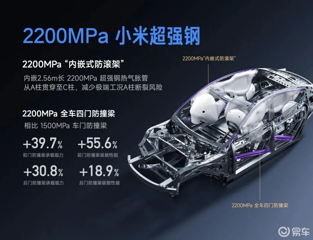 在安全方面,新一代SU7也进行了由内到外的全方位提升。全系标配由2200MPa小米超强钢打造的“内嵌式防滚架”,同时安全气囊数量由7个提升至9个,后排也有侧气囊。电池包底部覆盖了SU7 Ultra同款的防弹涂层,耐刮擦、耐撕裂能力较传统PVC涂层提升10倍,耐穿刺能力则提升了13倍。在大家最关注的门把手方面,新一代SU7标配三重冗余门把手,包括车外机械拉手、门锁冗余备份电源、车内应急机械拉手,即便在异常情况下,四个车门依然可以通过机械方式开启。