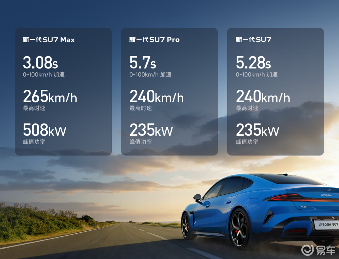 动力部分,全系搭载V6s Plus小米超级电机,标准版和Pro版均为后置单电机,最大功率235kW,零百加速时间分别为5.28秒和5.7秒,最高车速240km/h;Pro版搭载220kW前电机和288kW后电机,总功率来到508kW,零百加速时间仅3.08秒,较第一代车型的2.78秒有所下调,最高车速265km/h。电池方面,标准版和Pro版依旧采用磷酸铁锂电池,电芯分别来自宁德时代和比亚迪,容量分别为73kWh和96.3kWh,Max版采用三元锂电池,电芯来自宁德时代,容量为101.7kWh。