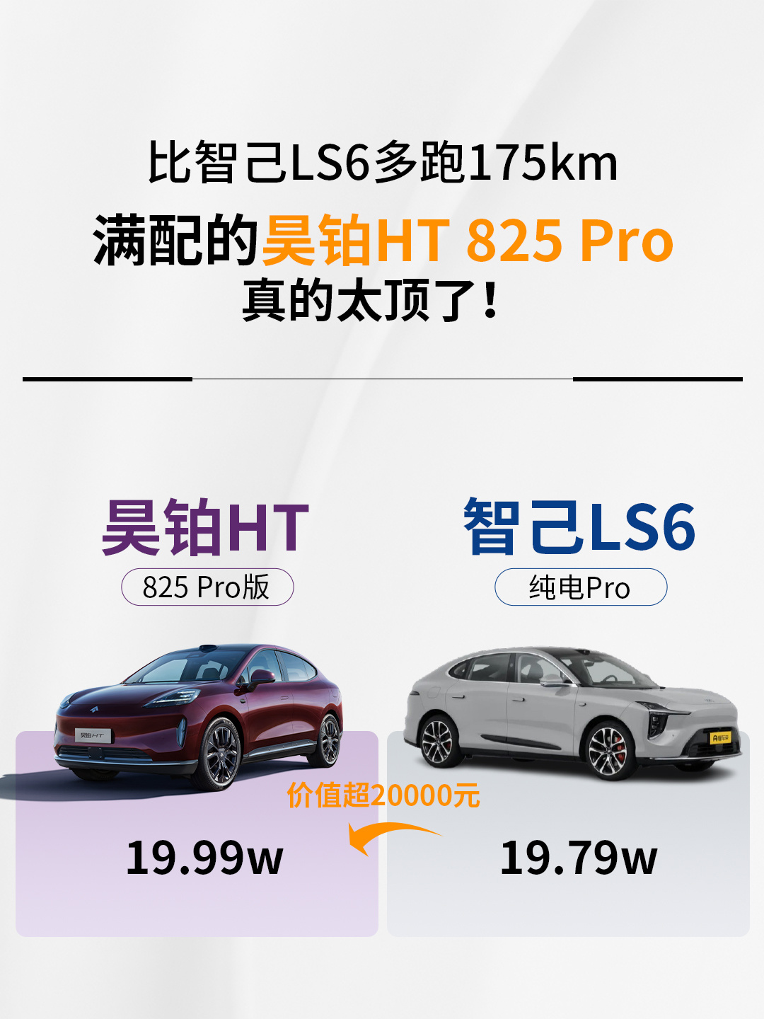 这时候,不少人都会看看市面上的热销车型,就比如终端价19.99万的昊铂HT 825 Pro,以及终端价19.79万智己LS6 纯电Pro,这两台车的终端价格都卡在20万以内,实际车价差了2000块钱,该选哪一台,不少人就会有些纠结。