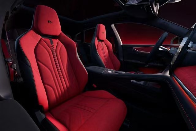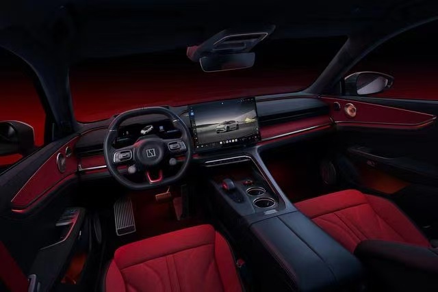 内饰方面也没有变化,配色以黑色搭配红色为主,提供有三幅式多功能方向盘、全液晶仪表盘、悬浮式中控屏以及电子档把,而且还有39.3英寸AR-HUD抬头显示。
