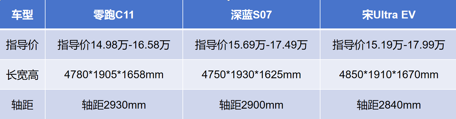 先来看看价格端,2026款零跑C11提供5个型号,指导价14.98万-16.58万,包含纯电以及增程式版本可选。深蓝S07提供7个型号,指导价15.69万-17.49万,也是走的纯电和增程式的路子。而宋ultra EV提供4个型号,指导价15.19万-17.99万,全系均为纯电动力。就价格端来看,零跑C11是这三款车型里面价格比较低的,而且提供两套动力形式。